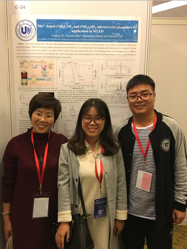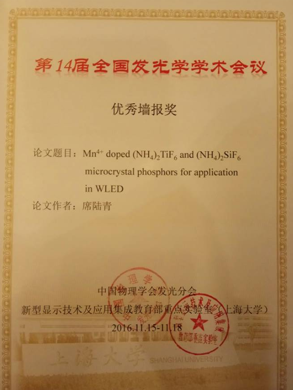 2016年11月15日-18日,第14 届全国发光学学术会议在上海举行,参会400余人。会议共收到墙报作品120余件,经会议常务委员无记名投票评出10项的优秀墙报奖。男同性恋AV 潘跃晓老师指导的15级研究生席陆青题为“Mn4+ doped (NH4)2TiF6 and (NH4)2SiF6 microcrystal phosphors for application in WLED”的墙报荣获了该奖项。特此祝贺!希望男同性恋AV 研究生取得更多更好的科研成果!