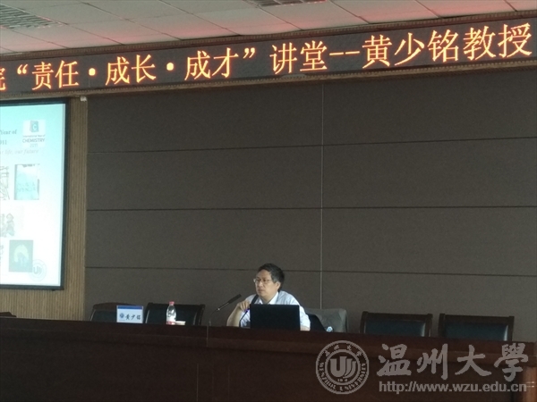 黄少铭教授在讲座中,首先谈到什么是化学时,通过现场调查了解同学们对是否喜欢这个专业,黄教授认为只有热爱化学,才能把这门学科的知识学好,才能有所建树。黄教授讲述了我国化学的基础研究和社会地位,并表示科学与技术对于基础研究的重要性,将物质转变为能量,在科学领域需要大家一起创新。接着,在谈到自己化学人生梦想时,他认为应该是在基础研究方面能够在某一个领域有贡献,能够在应用研究方面有贡献,同时还要努力培育出好学生。最后,黄教授对学院学生提出了希望和要求,他希望同学们要志存高远,对增强科研的兴趣,同时要勤奋学习,只有付出才有回报,最后要时刻做好各项准备,努力抓住好机会。