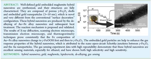 男同性恋AV 陈庆老师指导的李娜梅等同学利用电化学沉积技术与模板技术相结合制备出多层的Au-Fe双金属的纳米线,再通过氧化和真空加热处理得到Au-γ-Fe2O3复合纳米线(ACS Appl. Mater. Interfaces 2015, 7, 10534?10540; DOI: 10.1021/acsami.5b02087)。借助于XRD, SEM和 TG 等技术探索了合成机理,Au-Fe复合纳米线先转化成Au-γ-FeOOH,再转化成Au-γ-Fe2O3。该结构新颖独特,不同于以往的贵金属表面掺杂,Au被包裹在内部,表现为3-10nm的颗粒,纳米线的外侧为多孔的γ-Fe2O3薄膜。材料合成后,小组还做了气体传感性能测试。结果表明Au掺杂在半导体内大大提高了单纯铁氧化物对还原性气体的响应,这归功于在Au与γ-Fe2O3形成了开路肖特基结。该纳米线对乙醇响应尤其灵敏,选择性好,是检测乙醇的理想材料。