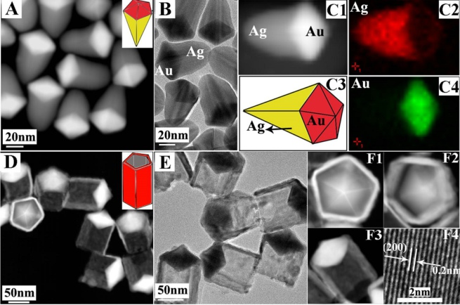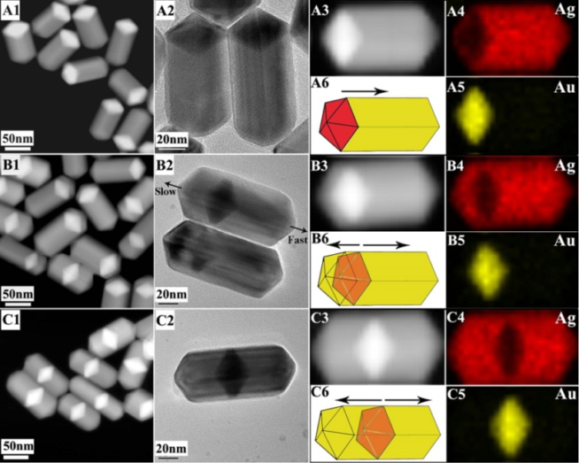 男同性恋AV 纳米材料实验室通过用单分散的金十面体纳米颗粒做种子,控制银在其表面的生长动力学,成功实现了非均匀的种子生长过程,制备了一系列新的纳米结构(图