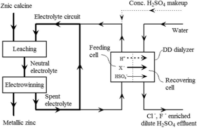 本学院工业电化学与膜过程课题组与北京京润环保科技股份有限公司合作,对困扰该行业发展的共性难题展开了系列研究。在利用传统扩散渗析技术(DD)对酸性硫酸锌电解液中游离H2SO4进行回收的过程中,首次在常规离子交换膜(IEMs)中观察到显著的同号(甚至同价态)离子之间的选择性。基于此,本小组提出了如下图所示的硫酸锌电解液选择性除氯新工艺。将DD技术的应用从酸/碱回收的局限拓展到离子的选择性分离领域。相关结果整理发表于膜行业权威期刊J. Membr. Sci. 2017, 537:111-118。