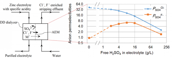该工作中Cl-相对于HSO4-表现出优先透膜扩散特性的原因可能在于两种离子水合半径的不同。由于HSO4-水合半径较大,其跨膜传输较Cl-更为困难。基于此指导思想,本小组猜测由于水合半径更大,二价的SO42-离子的跨膜传输可能更为困难,将酸性硫酸锌电解液中的HSO4-转化为SO42-或许能进一步提高去除Cl-的选择性,大大减小硫酸根的损失。实验表明,通过调节DD进料硫酸锌电解液的酸度,其脱氯的选择性确实会大大提高。当电解液酸度从160降至0 g/L时,Cl-/SO42-选择性从2.56增加到了42.8,而Cl-的去除率基本得到了保持。这种优异的选择性在常规IEM中是从未被观察到的。基于在近中性电解液中取得的结果,本小组对电解液除氯工艺开展了进一步的优化,相关结果最近发表于 J. Membr. Sci. 2018, 563:142-148。