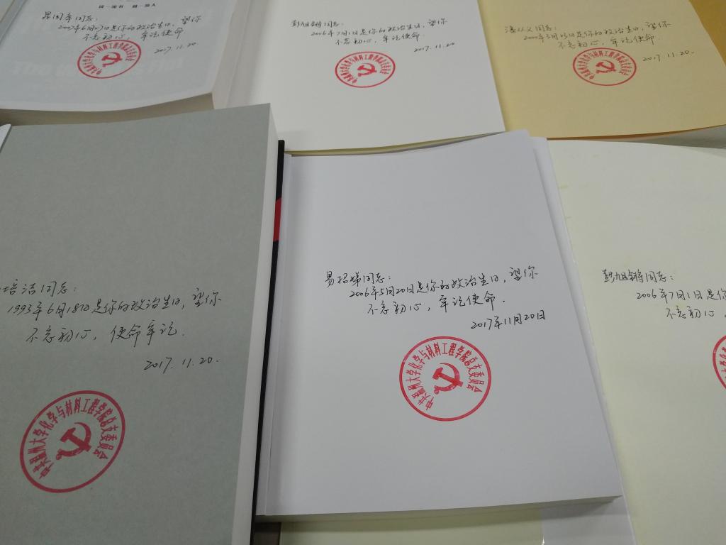 最后,支部进行了“书香传递”的支部赠书活动。支部为每位同志准备了一本红色书籍,并在赠送的书的扉页上写上该党员政治生日——入党时间,提醒党员“不忘初心,牢记使命”。