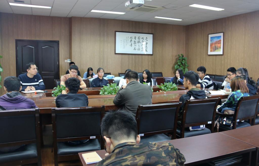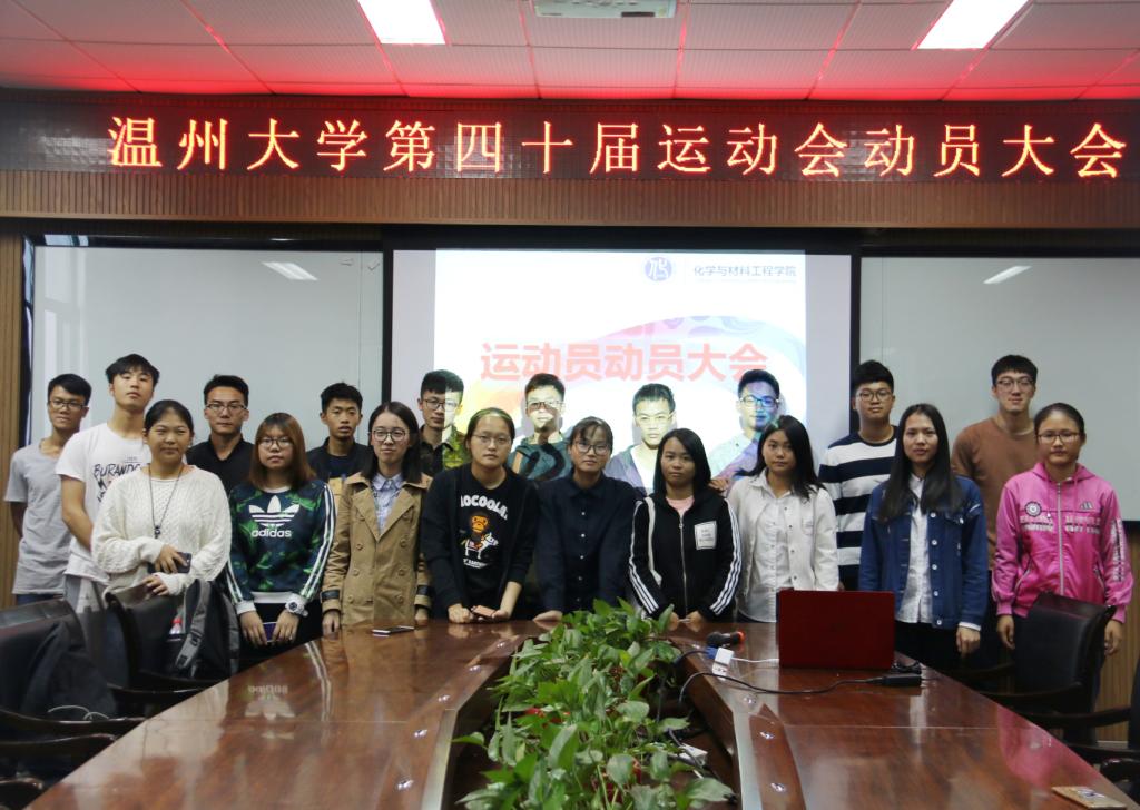 在化材楼11B204室召开第40届校运会动员大会。出席大会的有学院党总支副书记潘从义、学生科副科长易招娣、研究生辅导员邹涌彬、学生会主席章林祥及全体运动员、后勤保障人员。动员会由易招娣老师主持。