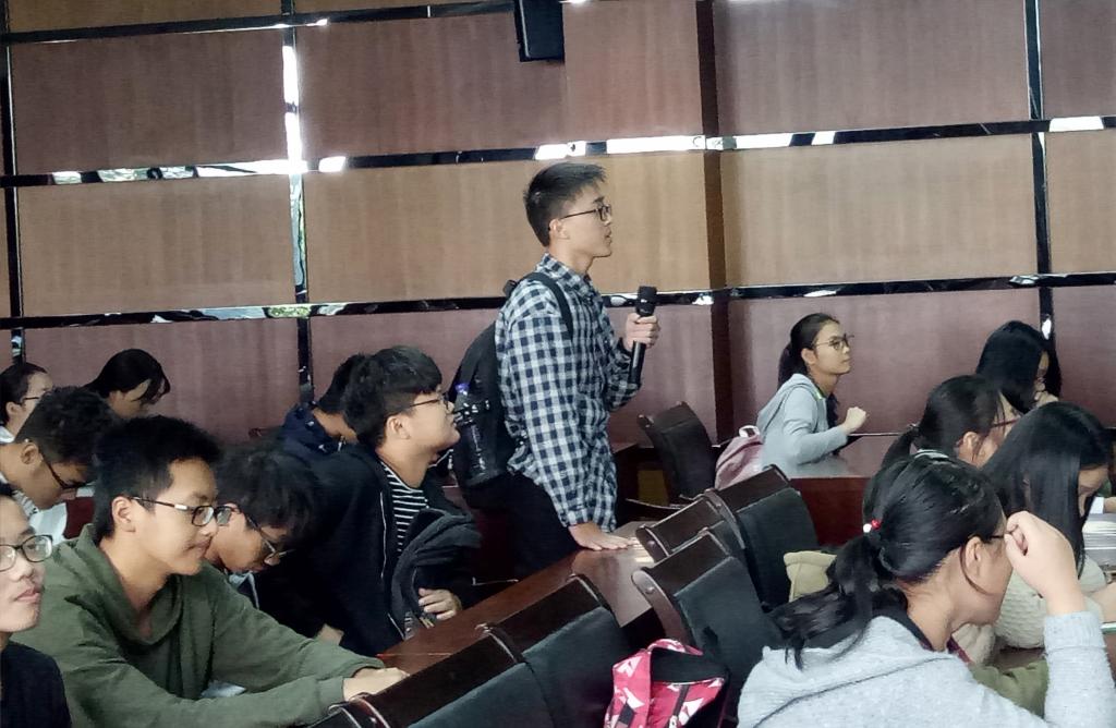 会上,首先是班长郭祥瑞介绍了班内的情况。接着,同学们进行自我介绍。但是,这次自我介绍的方式有些特别,是通过“击鼓传花”的游戏进行的——传到的同学要介绍一条自己的信息,第二个同学首先要先把前面同学的信息复述出来,然后再介绍自己的信息,但是要比前一个同学多介绍一条自己信息,以此类推。无法复述的同学获得了一次展示才艺的机会。每位同学都积极参与到游戏中,有些同学还记录下了每一个自我介绍的同学的信息。