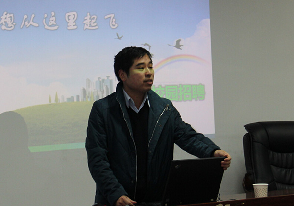 在接下来的招聘会环节中,九洲药业公司的负责人首先为我们播放了时长约6分钟短片。该片主要向我们介绍了九洲公司的公司概况,包括公司职业环境,市场竞争力,技术设备等。然后,又通过PPT具体的向我们介绍了公司所在城市的基本情况,企业的工作环境,产品分类与领域,未来的发展以及对员工的培训和福利等一系列情况。九洲药业公司负责人特别向在座同学强调了公司的核心理念:质量就是价值,员工就是财富,创新就是未来。从九洲药业的核心理念中,我们不难看出公司对人才的重视。