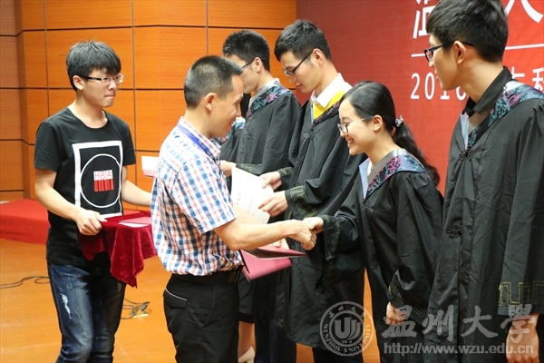 典礼上,学院院长王舜、党支部书记方乐平分别为6位获得省优秀毕业生和32位获得校优秀毕业生的同学颁发证书,副院长陈久喜为校友联络员颁发聘任,班主任为毕业生赠送纪念品。