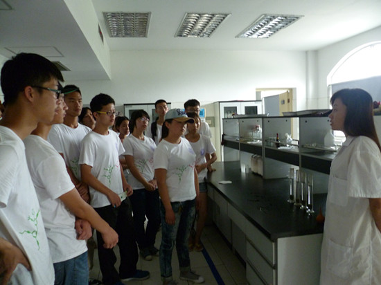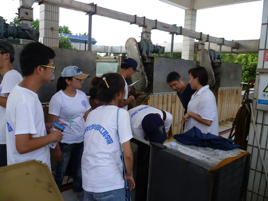 七月,透蓝的天空,悬着火球似的太阳,云彩好似被太阳烧化了,也消失得无影无踪,队员们在燥热的空气中顶着太阳挥汗如雨般前行,到达水务公司后,在实验检测员的带领下分别参观了化验区和微生物实验室。在检验员的讲解下,队员们了解整个测水质的过程、原理、试剂、设备等及净化的工艺流程,一些水质含量如:微生物含量、悬浮固体颗粒等可以直接通过仪器分析精确读出,不似化学分析方法繁琐,减小了系统误差;进水经过物理方法、生物方法、氧化沟沉淀池等一系列的工艺流程的得到净化。队员们还实地参观了水质处理过程。最后,调研组分别就未处理的水样和处理的水样进行了取样,并跟工作人员交流了水质设计值的合理范围。