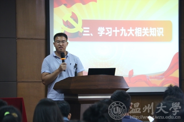 邹涌彬老师首先通报了到会情况,介绍了本次主题党日活动的主题、内容和流程。会议严格落实温州市委组织部“六制六规范”的要求,全体党员佩戴党员党徽,诵读党章,重温入党誓词。会议学习了党的十九大召开相关背景知识,观看黄大年、姚玉峰、陈莹丽同志先进事迹、浙江先进人物季庆泉、潘宝良同志微电影。