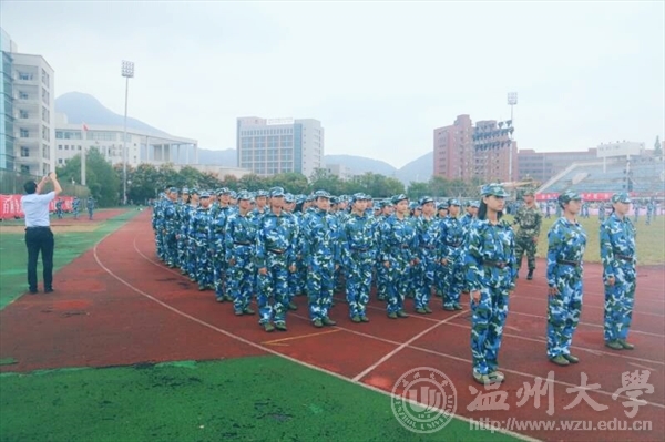 正在参加军训的新生和教官。