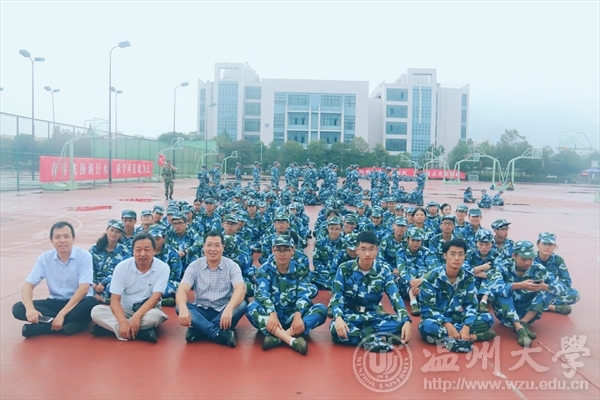 领导老师跟军训新生一起合影留念。