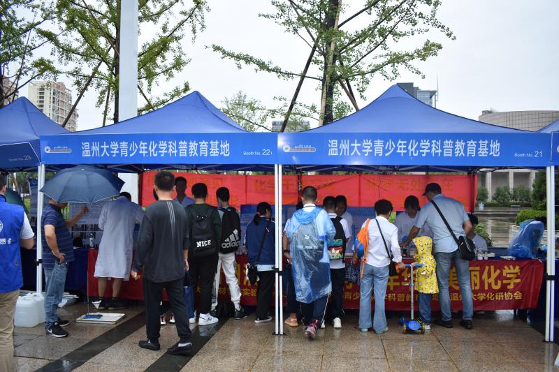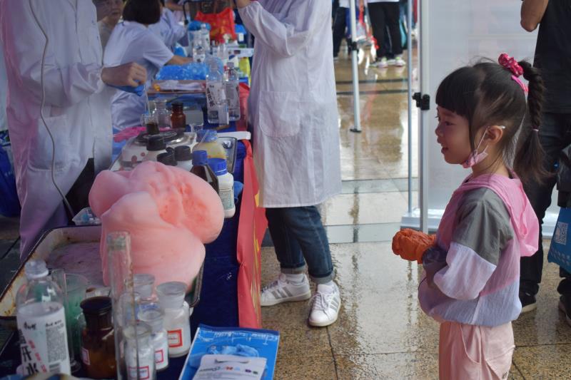 化学科普教育基地的摊位很是热门。无论是年幼的孩子还是中学生,甚至陪同的家长也一道被摊位前展示的神奇化学实验现象所吸引并驻足观看。此外,摊位上还精心准备了“大象牙膏”、“彩色的小鸟”、“红旗插在黑面包上”等各式各样趣味化学实验,让同学们亲自动手体验。印有化学小知识的科普小册子也深受大家的喜爱。