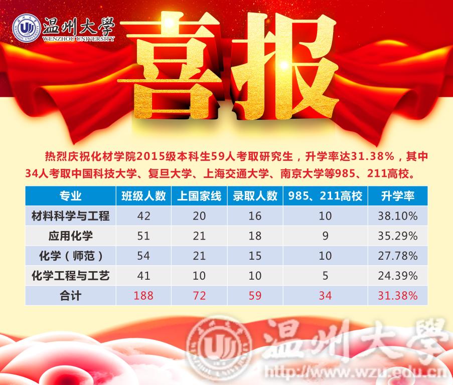 2019届学生考研工作再创佳绩。学院2019届毕业生共188人,90人报考研究生考试,71人过国家复试线,过线率达到报考人数的78.9%;其中59人成功被录取,录取率达到报考人数的65.6%,占全体本科毕业生数的31.4%;有34人被中科院、复旦大学、南京大学、上海交通大学等985、211高校录取,考研录取率和考取名校人数创历史新高。