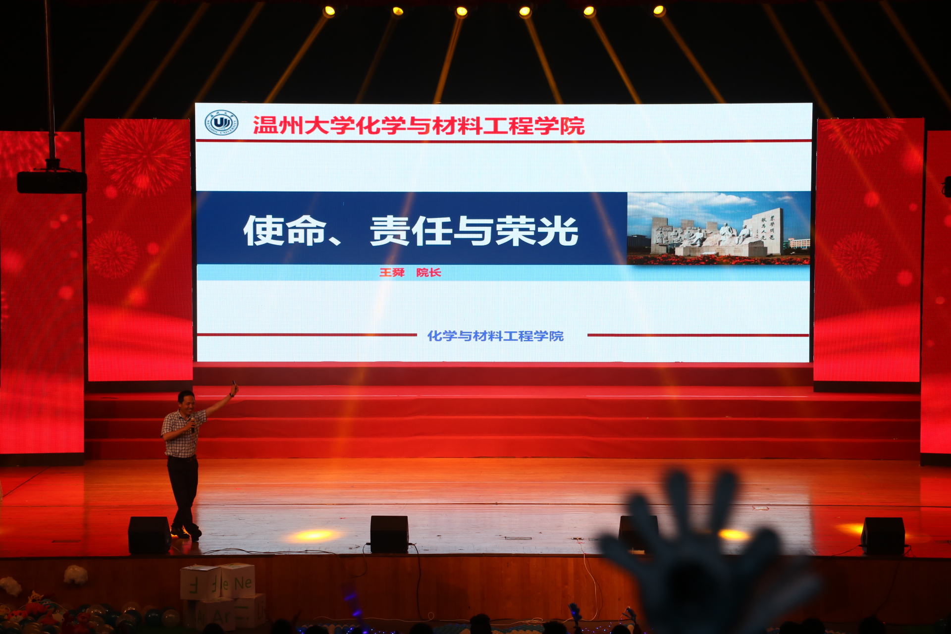 院长王舜、党委书记方乐平、副院长杨小平、副院长陈久喜、副书记潘从义等。学院各系主任、化材之光校友及全院师生参加了本次会议。