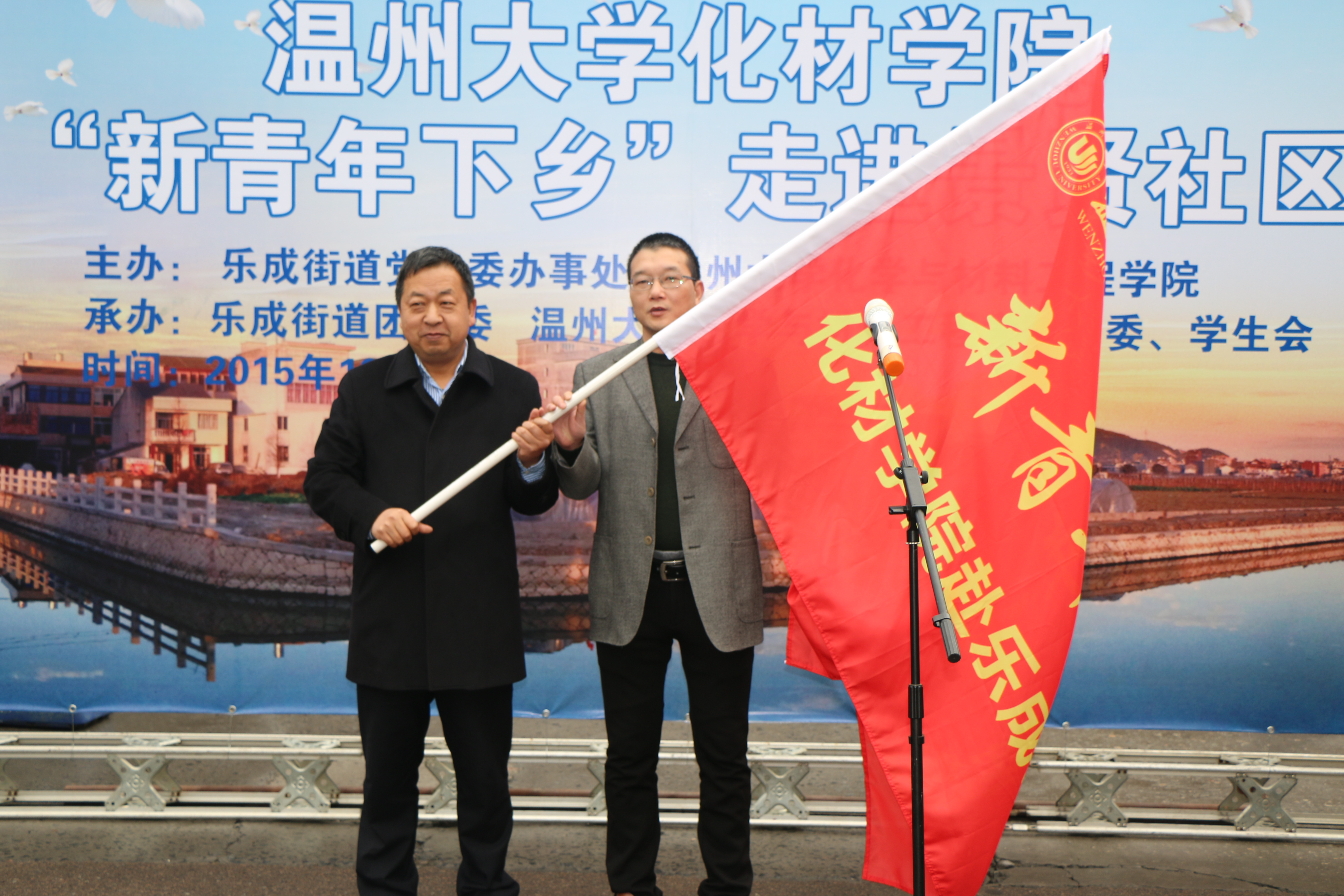在活动的一开始,胡景锋部长及潘从义副书记分别为此次活动发表了讲话,对本次活动给予大力支持的乐成街道领导和乡亲及精心筹备活动的学院师生表示衷心的感谢。随后方乐平书记为“新青年下乡”实践队进行了授旗仪式。