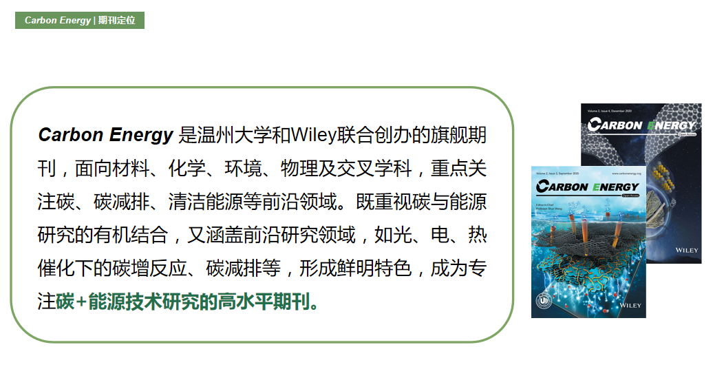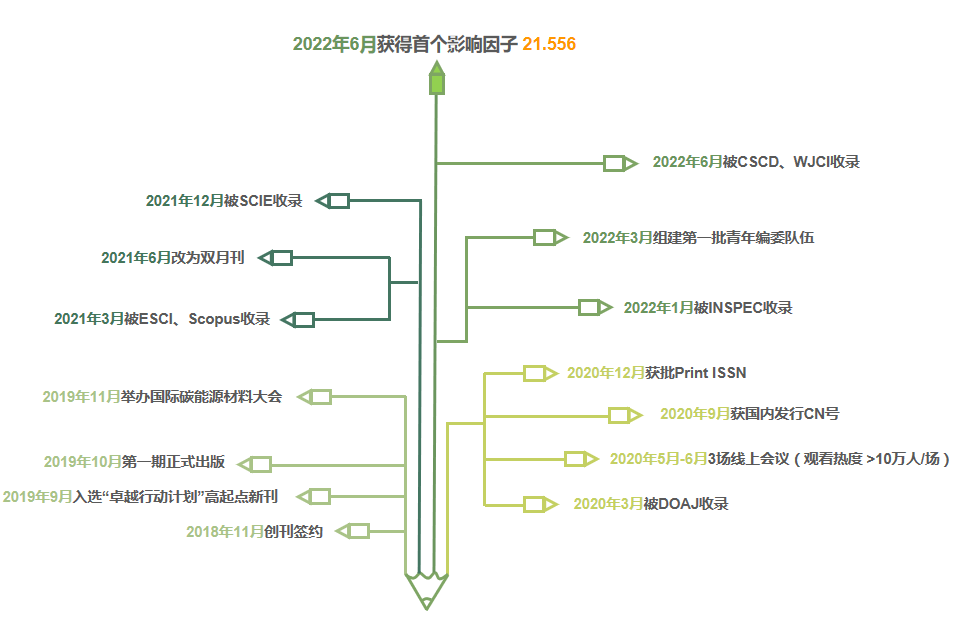 和Wiley出版集团联合创办的旗舰期刊Carbon Energy获得了自2019年创刊以来的第一个影响因子(Journal Impact Factor)—21.556。4个细分领域内位列 Q1 分区,其中在CHEMISTRY, PHYSICAL 排名 8/163 ;ENERGY & FUELS排名 7/119 ;MATERIALS SCIENCE, MULTIDISCIPLINARY排名14/345;NANOSCIENCE & NANOTECHNOLOGY排名6/109 。