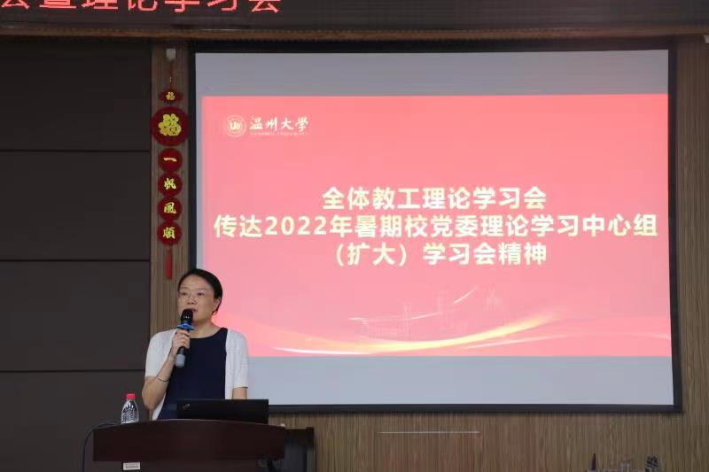 会议第五项,刘吟书记部署相关工作。刘吟书记代表学院领导班子对所有教职工送上节日的问候与祝福,感谢老师们一直以来的辛勤耕耘与默默付出。随后,她向广大教师传达了2022年暑期校党委理论学习中心组(扩大)学习会精神,并对校党委书记谢树华的《以现代化治理推动高质量发展》和校长赵敏的《面向“双一流”深入实施学科驱动战略 推动学校在新阶段实现高质量发展》主题报告进行了深入解读,对学院师德师风专题教育、疫情防控、意识形态、社会培训、校友会以及防诈骗等工作进行了相应部署。