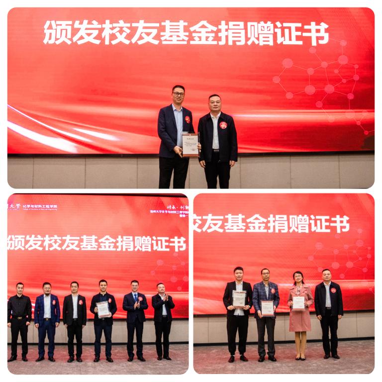 潘玉驹为荣耀教育基金捐赠者82级化学陈仁尔,鸿鹄奖学金捐赠代表99级工分丁卓友、02材料张里艺、01应化谷雨、01应化黄通丰、03应化曹高放,88级化学班校友代表张疏流,79级化学王伯华、80级化学连千荣颁发基金捐赠证书。
