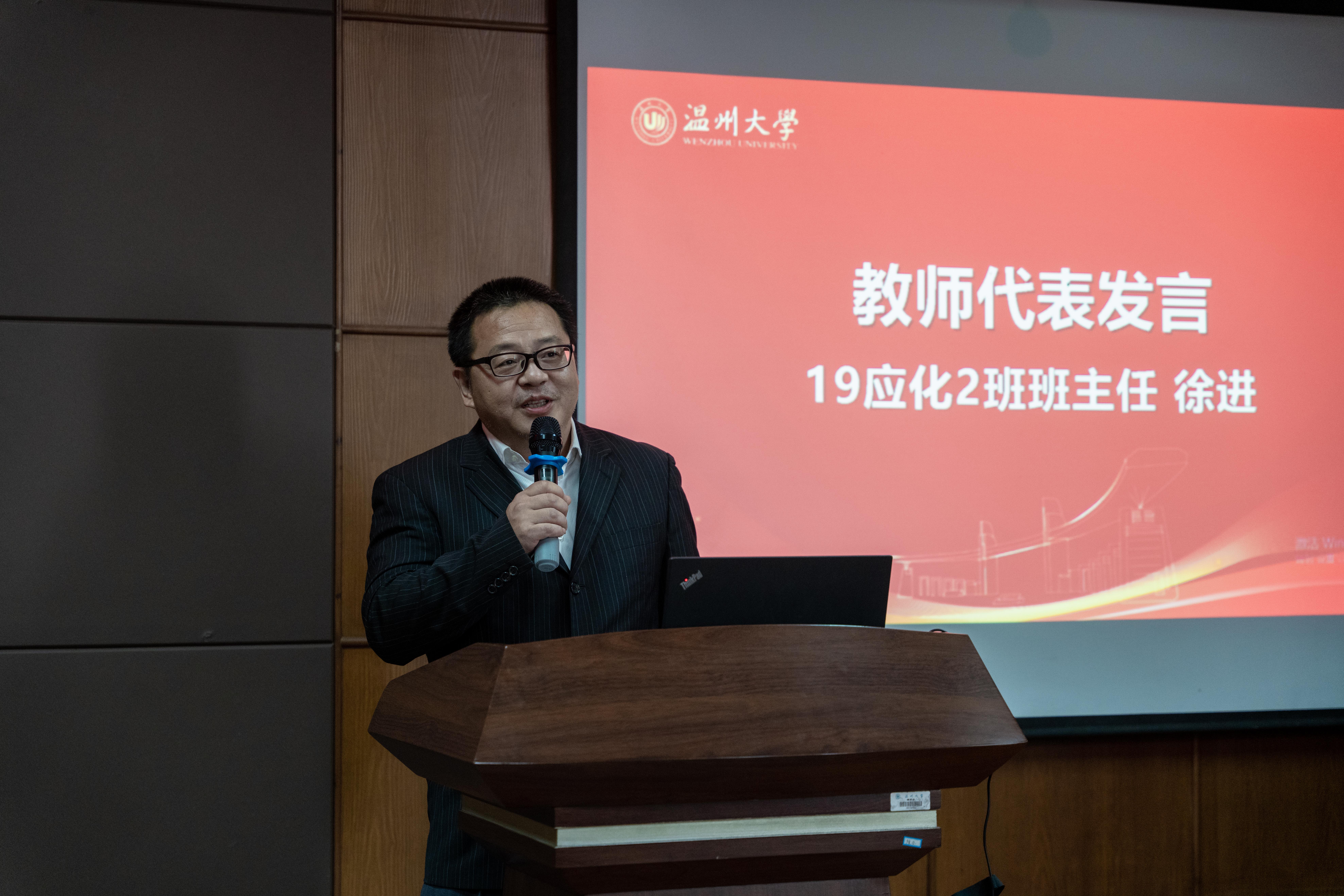 随后,19应化2班班主任徐进老师作为毕业生班主任代表进行了发言,他表示每位同学都能好好地来到毕业典礼,拿到属于自己的毕业证书,这本身是很大的一个成就,同学们可以感谢曾经的自己。最后他再次强调了“敢为人先”的校训精神,希望同学们时刻不畏困难,坚持创新。