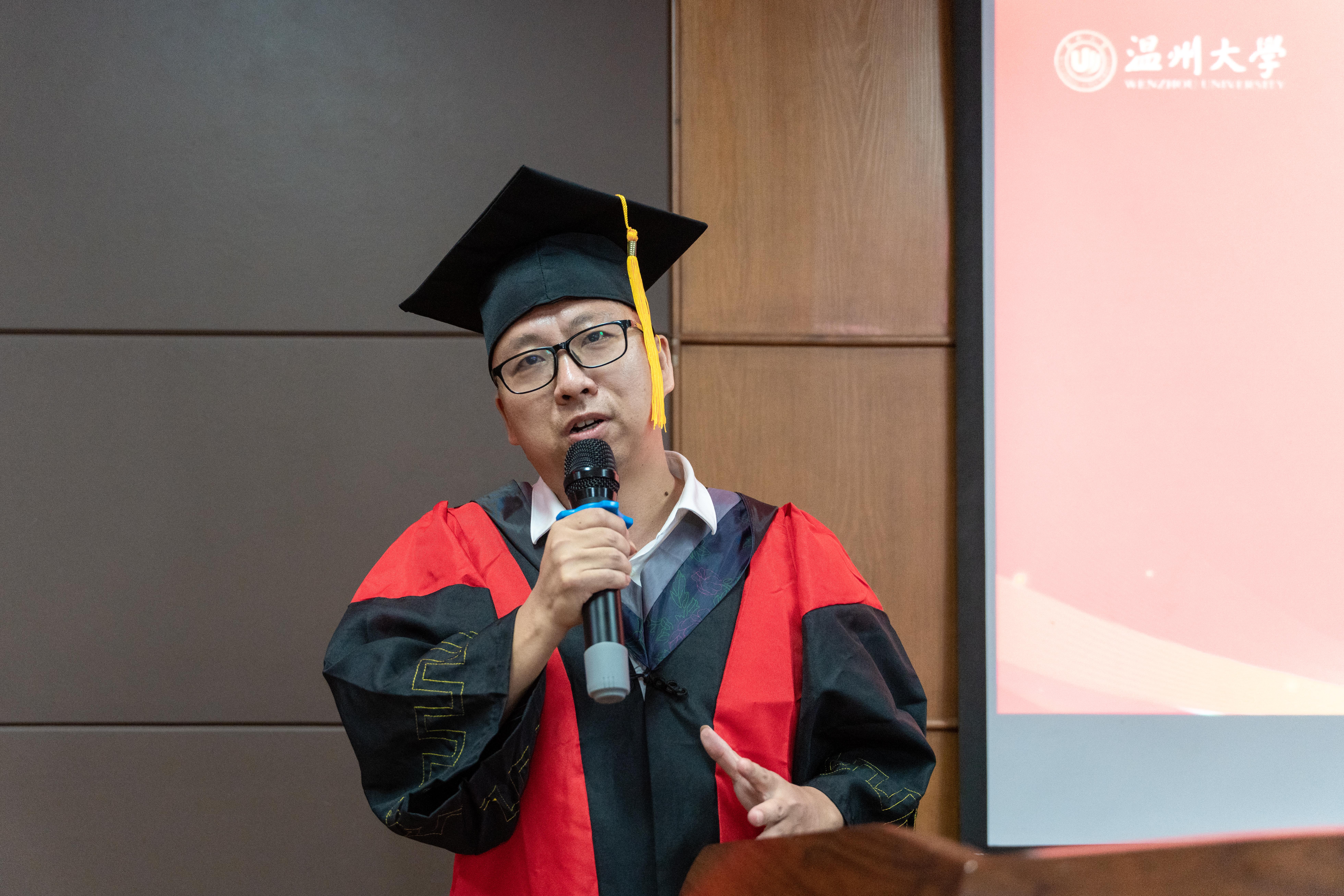 在庄严肃穆的国歌声后,院长杨植代表学院致辞。他向毕业生们表达了最热烈的祝贺和最诚挚的祝福。同时,他对即将踏上新征途的同学们提出了三点期望:一是要敢于自信,领先的学科基础、雄厚的师资力量铸就化材人自信的基石。二是善于学习,希望化材学子秉承温大“求学问是,敢为人先”的校训精神,在不同的行业中向不同的优秀人物学习。三是勇于奉献,在奉献中实现人生价值和社会价值。最后,杨院长也欢迎同学们无论身处何地都不忘常回母院看看。