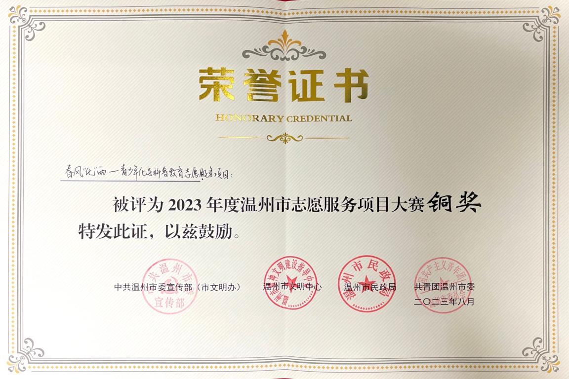 申报的春风“化”雨——青少年化学科普志愿服务项目与温州各地方选送的项目同台竞赛,最终获得2023年度温州市志愿服务项目大赛铜奖!