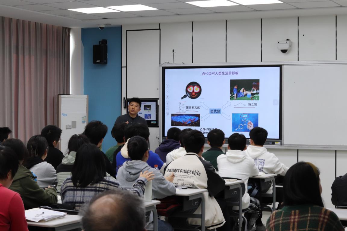 课上,邵银林老师展示出卓越的教学风采,灵活运用信息化平台,积极鼓励学生的参与、交流和发言,充分展现其扎实的教学基本功,有效地激发了课堂活力。通过对DDT的发展史,指出DDT是一把“双刃剑”,并引发学生面对利弊时做好“取舍”。对冰箱制冷剂氟利昂的讲解,结合习近平总书记提出的碳达峰碳中和目标,引发同学们对环境保护的思考,并以此助力我国经济绿色发展迈上新台阶。随后,通过丰富的图片和视频,邵银林老师结合化学生物武器所带来的生化危机,让学生们直观地感受到战争所带来的苦难,更加珍惜当下的和平,强化了学生们的爱国情怀。在学习化学内容的同时,邵老师不失时机地穿插与篇章内容相关的时事和思政点,让课程内容学习与价值引导相融合。经过广泛搜集素材、精心设计教学,让课堂实现了“如盐入水”的育人效果。