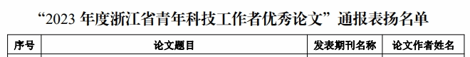 据悉,为贯彻党的二十大精神,落实中央和省委人才工作会议部署,鼓励广大青年科技工作者切实加强基础研究和关键核心技术攻关,将更多的研究成果发表在国内外科技期刊上,推进高水平科技自立自强,浙江省科协组织开展了“2023年度浙江省青年科技工作者优秀论文”通报表扬活动,将浙江省内40周岁以下青年科技工作者为第一作者,在2021年1月1日至2022年12月31日之间发表在国内外科技期刊上的优秀论文进行表彰。