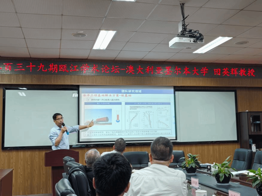 田英辉教授在讲座上首先介绍了下一代的漂浮式基础设施,包括传统海上油气工程、海上风电工程、悬浮隧道和悬浮机场等基础设施;之后介绍了漂浮式基础设施的锚泊系统,包括锚链和锚固基础,介绍了目前存在的挑战和问题;然后系统地介绍了板锚安装方面的研究成果,包括大变形有限元分析和离心机试验等方面的成果;最后介绍了在墨尔本大学开发的集成建模包,可考虑桩基、锚链和锚固基础等多种结构与土的相互作用。