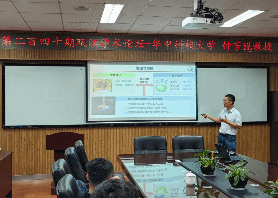 报告结束后,钟芳锐教授进行现场答疑。现场师生对于人工光酶不对称催化前沿领域产生了浓厚的兴趣,参加的老师和学生提出了多个相关问题,钟芳锐教授对提问进行了详细解答,并同参会的老师进行了深入探讨。这次讲座让师生们对化学原理驱动的人工光酶不对称催化有了更深层次的了解,激发了师生们对化学原理驱动的人工光酶不对称催化的兴趣。