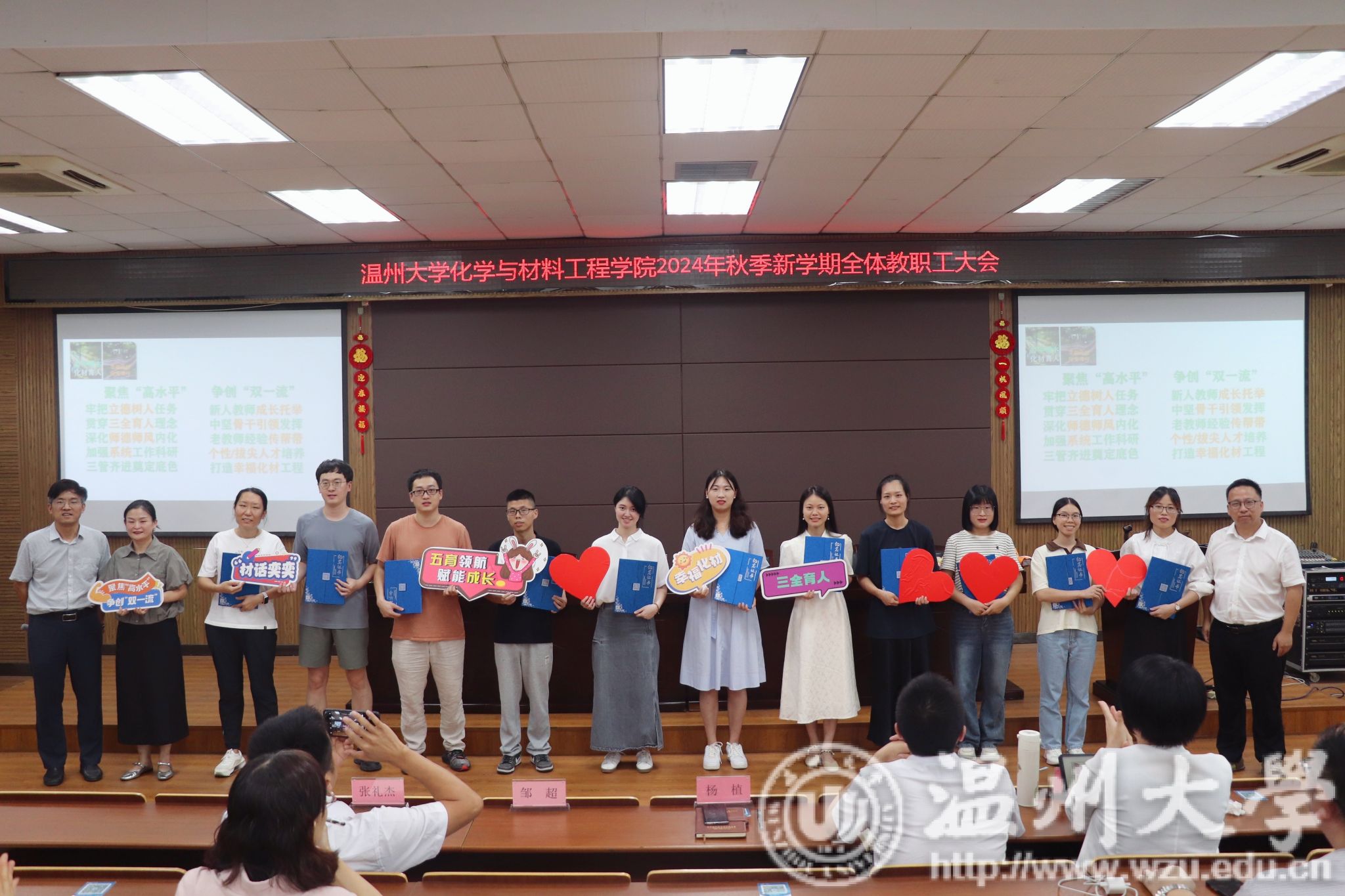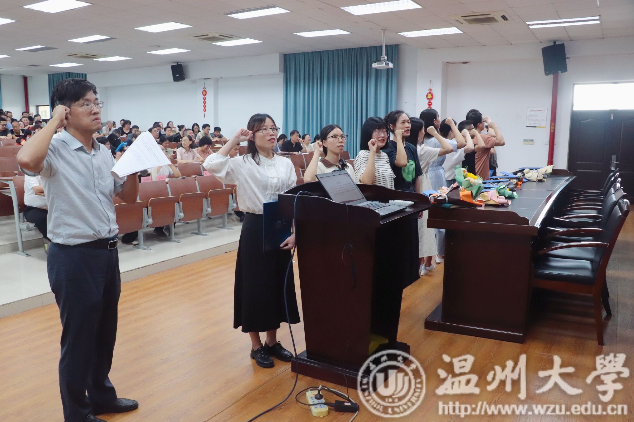 会上,举行了新教师入职仪式。邹超书记介绍了学院今年新教师引进情况,并请新教师逐一进行自我介绍。学院院长杨植为他们颁发入职纪念证书和鲜花,并在邹超书记的带领下,全体新教师进行了入职宣誓。