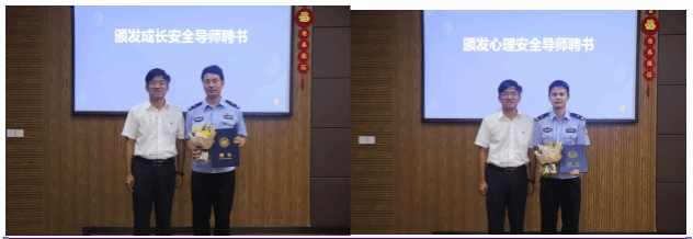 邹超书记为陈海敏副所长、史铁军警长分别颁发了成长安全育人导师、心理安全育人导师聘书,期待他们以专业智见与学院全员育人链条一同持续为学院学生五育并举、拔尖成才、全面发展提供有力保障支持。