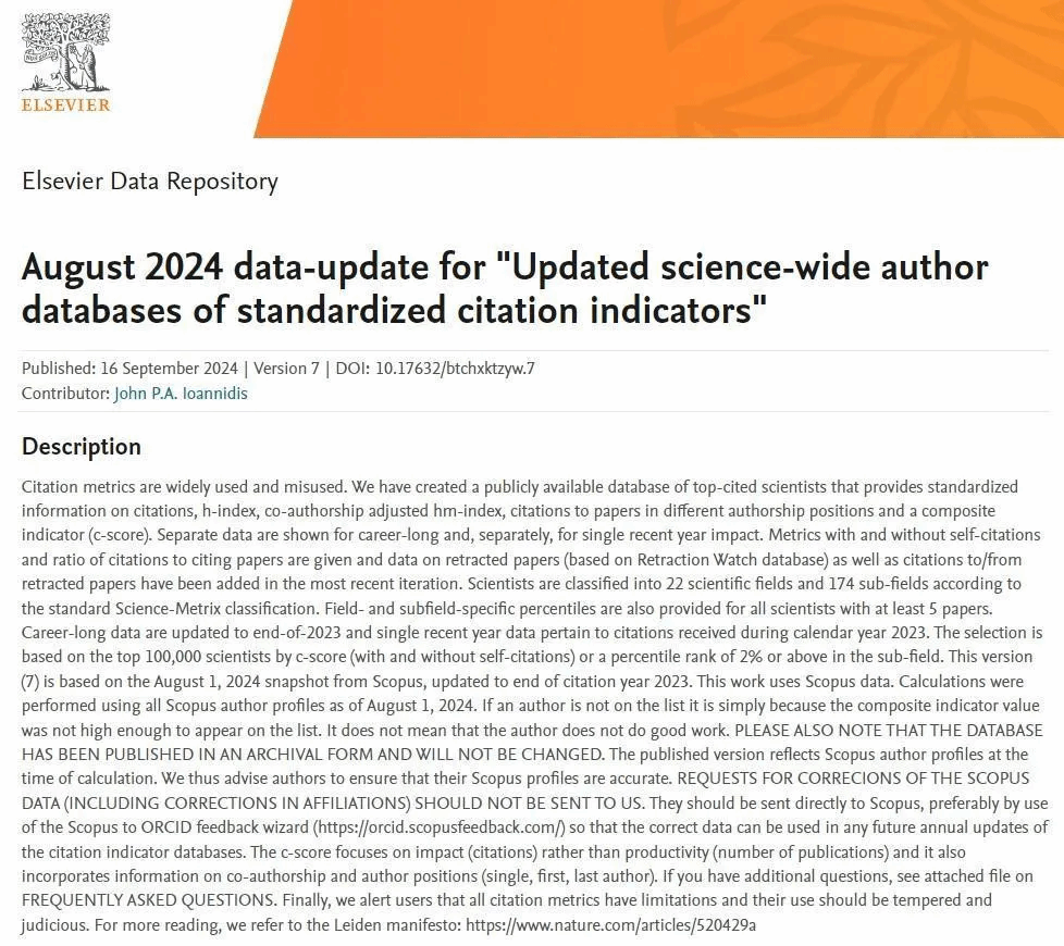 近日,美国斯坦福大学和Elsevier数据库发布了2024全球前2%顶尖科学家榜单(World's Top 2% Scientists 2024),并于Elsevier旗下Mendeley Data发布(2024 data-update for“Updated science-wide author databases of standardized citation indicators”)。男同性恋AV