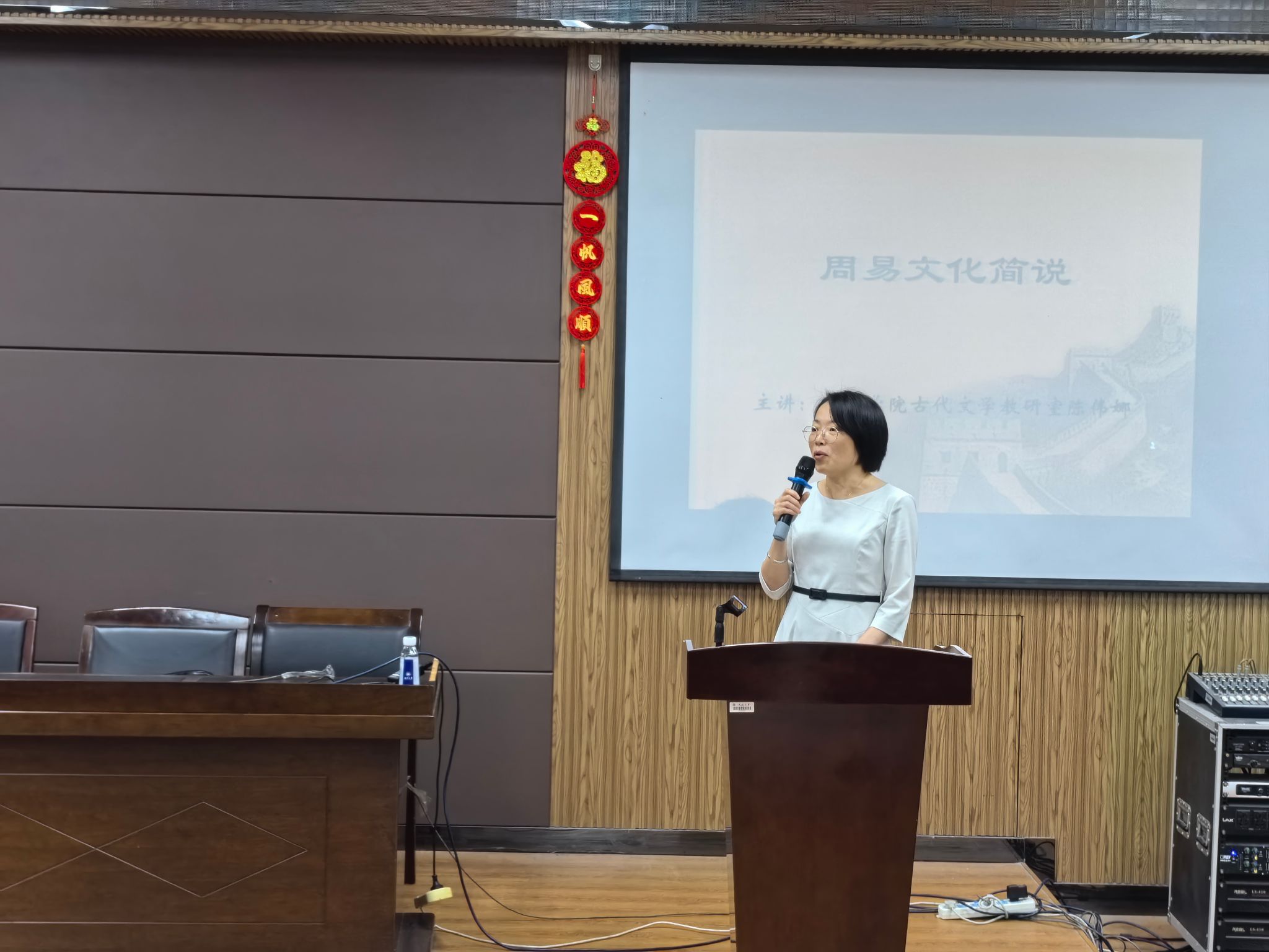 陈伟娜老师围绕“《周易》乾卦与人生”这一主题,向大家讲述了《周易》乾卦中隐含的人生哲理。随后,陈伟娜老师与老师们展开了愉快地交流:由中国人、韩国人、日本人筷子形制的差异及降龙十八掌的招式,引出阴阳、“《乾》:元,亨,利,贞。”和“初九、九二、九三、九四、九五、上九和阴九”等知识,深入浅出。同时,陈伟娜老师还以人生的工作阶段为例,讲述了“乾卦”中蕴含的处世哲学,使大家深受启发。