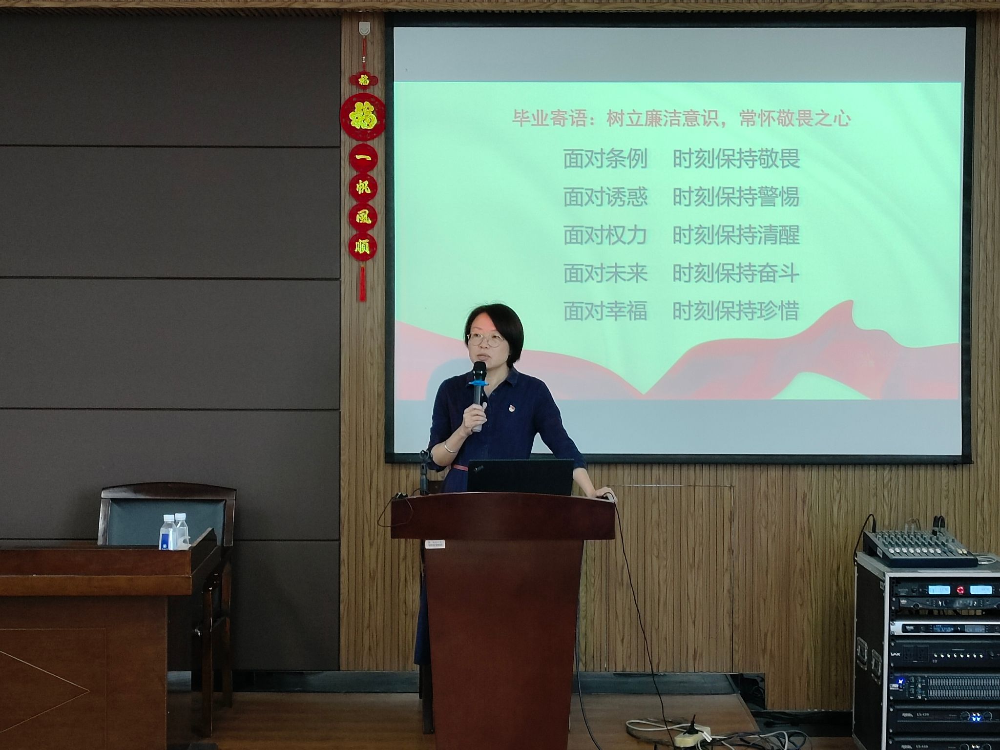 党委书记刘吟老师致辞并讲授毕业生最后一次党课——《廉洁与青春同行,清风与奋斗相伴》。刘吟老师以《廉洁与青春同行,清风与奋斗相伴》为主题,从“坚定理想信念,找准第一粒扣子”、“坚持艰苦奋斗,钉实第一粒扣子”、“严守规章制度,扣紧第一粒扣子”三个方面讲授廉洁纪律教育专题党课,通过典型案例警示教育毕业生要树立廉洁意识,常怀敬畏之心。