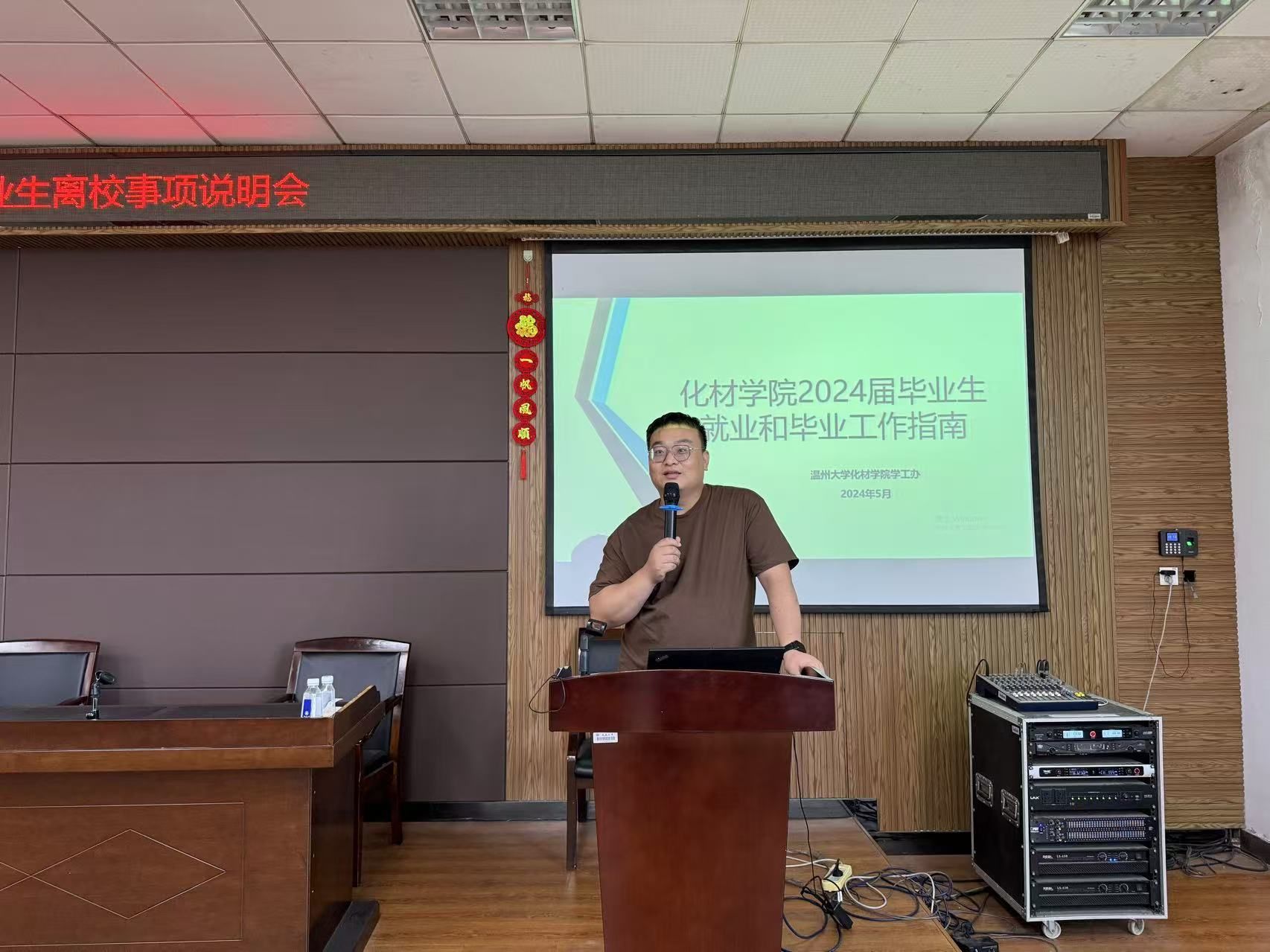 党委于2024年5月16日上午在化材楼11C401召开2024届毕业生远航教育大会暨毕业事项说明会。会议由学院学工办主任邹涌彬老师主持,学院党委书记刘吟老师、学院党委组织员陈旭老师、就业辅导员李国朋老师出席会议,2024届全体本、研毕业生参加会议。