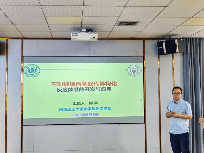 讲座中,何英教授以手性合成领域的前沿需求为切入点,系统介绍了 “不对称烯丙基取代异构化反应” 的核心机制。他首先剖析了手性烯丙基化合物双向异构化的创新路径,通过设计独特的催化体系,实现了反应选择性的精准调控。针对轴手性苯乙烯的合成,何英教授重点讲解了 AASI(不对称烯丙基取代异构化)策略的优势 — 该方法不仅突破了传统合成中立体选择性的局限,还通过 DFT(密度泛函理论)计算揭示了反应过渡态的电子效应与空间位阻影响,为分子设计提供了理论支撑。此外,他结合产物转化实例,展示了该反应在药物中间体合成中的应用潜力,并创新性地提出将烯烃 Z/E 异构化与位置异构化相结合的催化思路,为手性分子构建提供了全新范式。讲座过程中,何英教授以生动的案例和缜密的逻辑,将复杂的反应机理转化为深入浅出的学术表达,引发在场师生的热烈讨论。