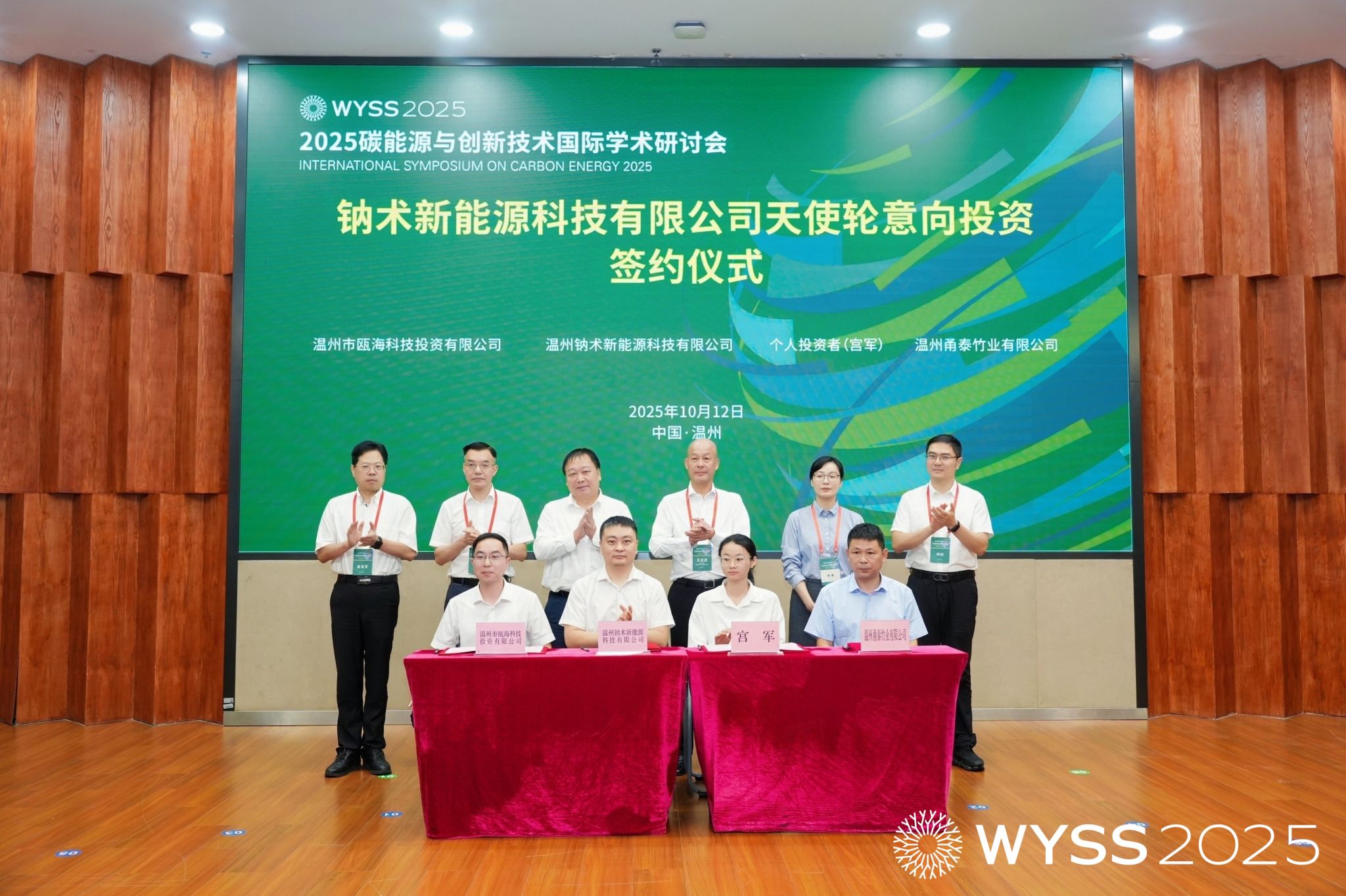 碳中和技术创新研究院院长、钠术新能源创始人侴术雷,个人投资者宫军、温州市瓯海科技投资有限公司董事长兼总经理黄浩然等投资方代表及产业合作方温州甬泰竹业有限公司陈正汉上台签约;赵敏校长、王达武副主席、朱启仁副部长、瓯海区常务副区长林蔓、温州市科技局副局长金龙军、温州市经信局总工程师林剑共同见证,为温州碳能源技术产业化注入新活力。