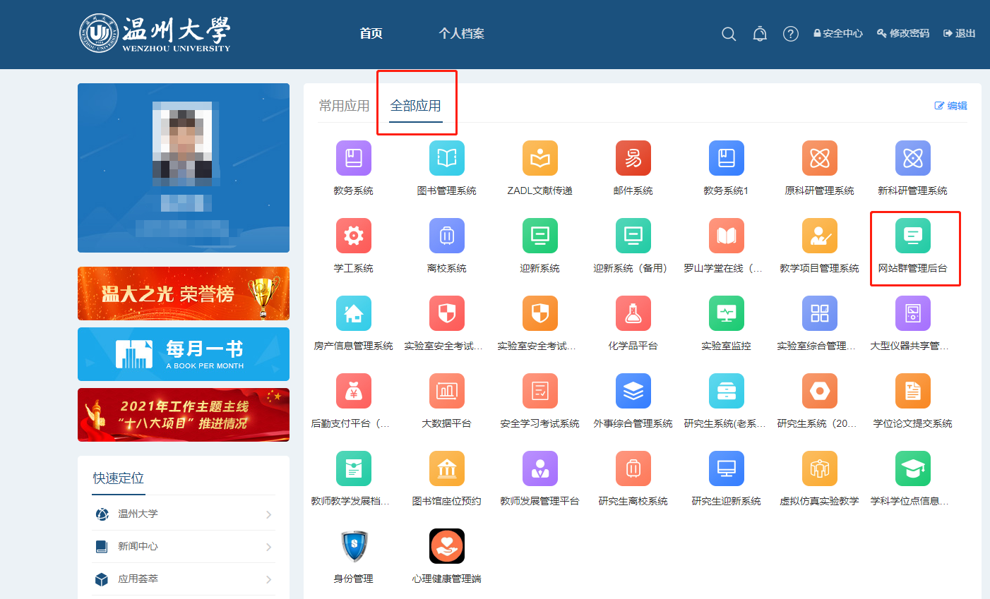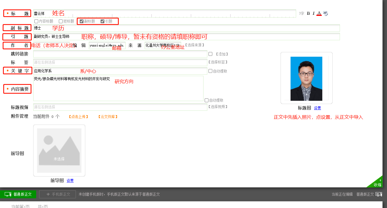 站群管理平台,为广大老师了解在新平台新增/修改个人信息的操作步骤,为此办公室特收集相关资料,分享给各位老师,供大家参考:(请注意:老师们只需要修改师资力量里的个人简历即可,硕导/博导的信息由学科办增减,老师无需自行操作,谢谢!)