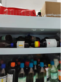 试剂柜最上层试剂瓶横放,有泄漏危险 |