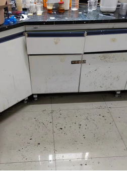 试剂瓶翻倒,试剂外溢;卫生差 |