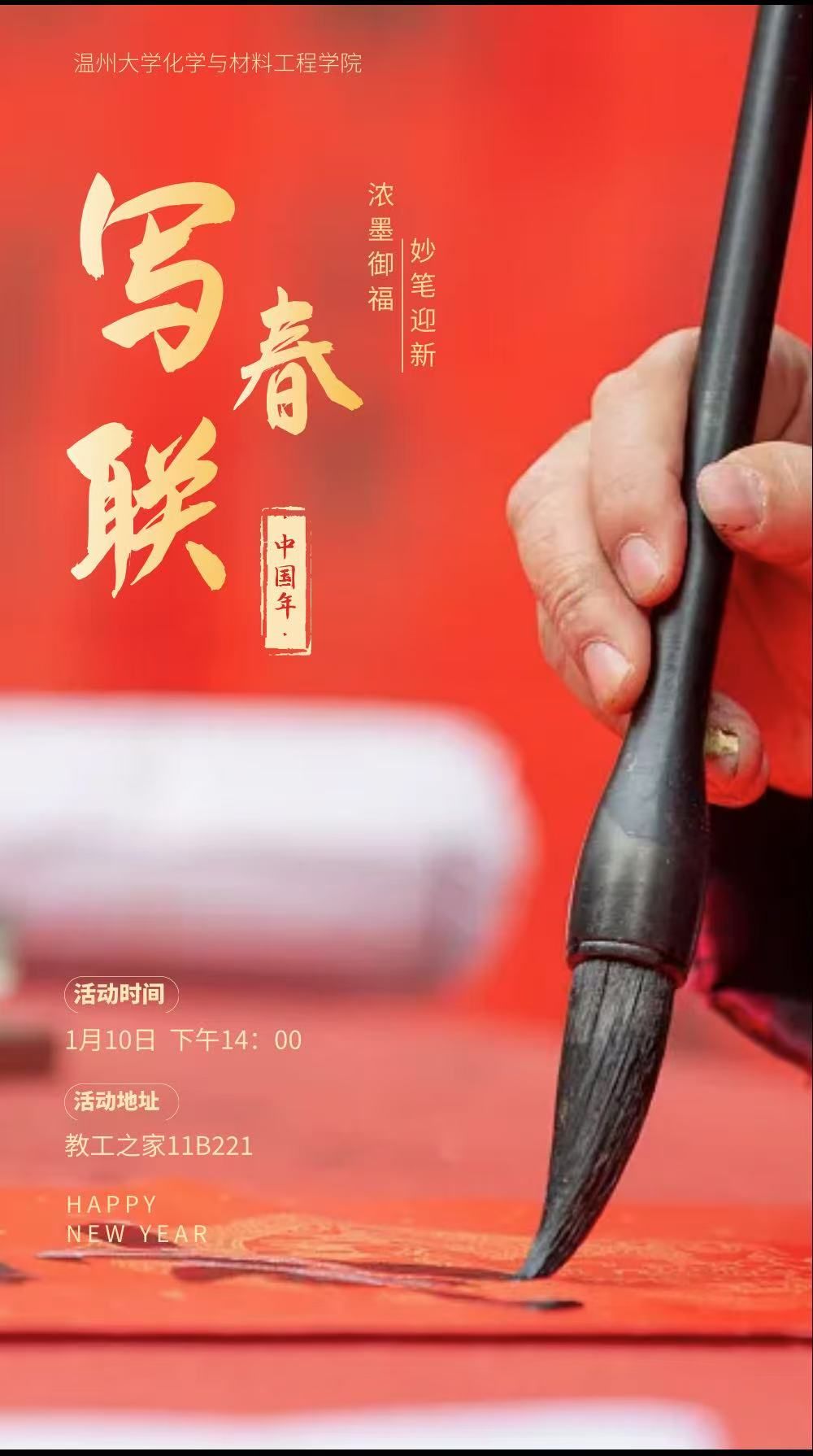 为迎接2025年农历新年的到来,学院工会、研会在教工之家组织开展“龙含宝珠辞旧岁,蛇吐瑞气贺新春”为主题的迎新春为写春联、写福活动,现将有关事项通知如下:
