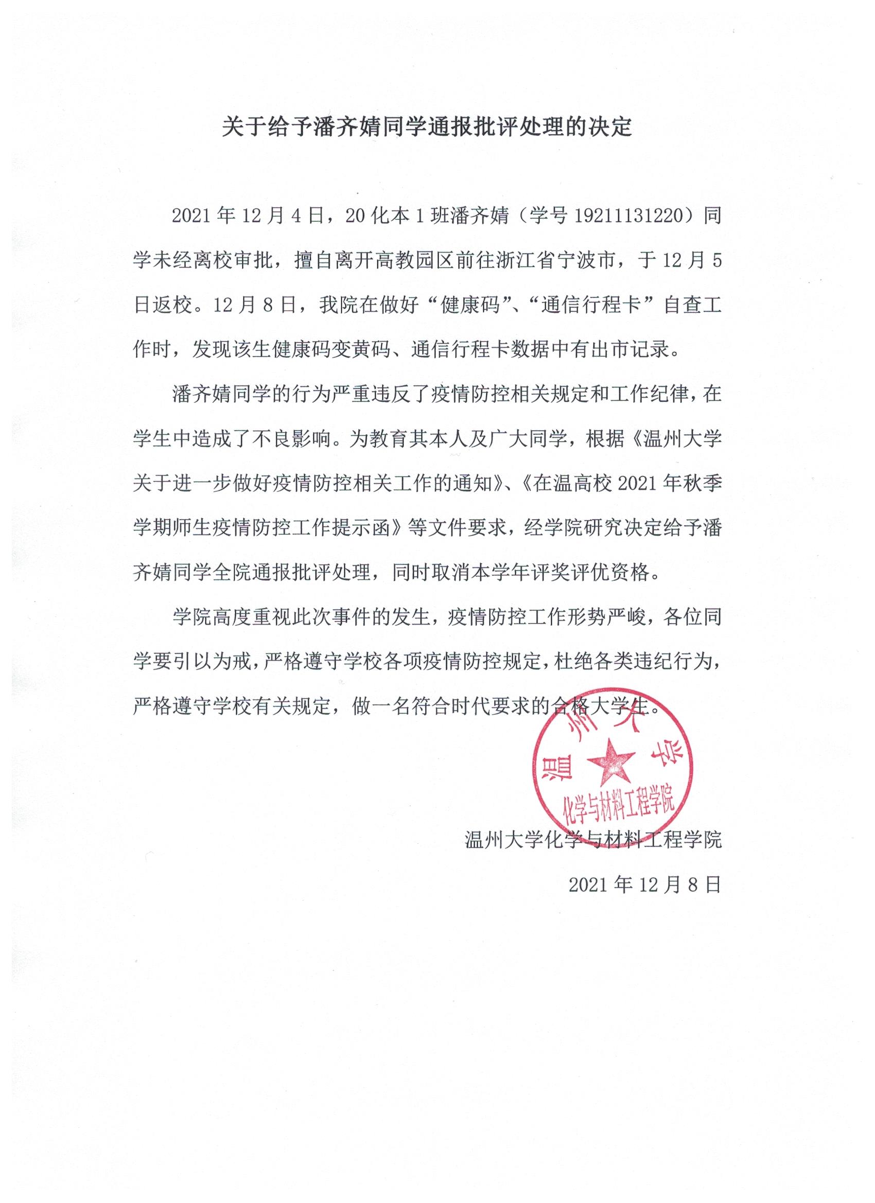 关于给予潘齐婧同学通报批评处理的决定