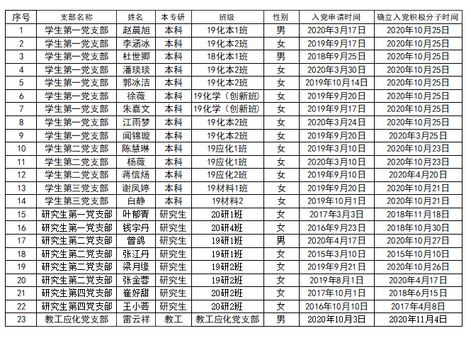 经本人申请,党组织一年以上的培养教育和考察,各支部于近期组织发展对象公开答辩,并征求党员、群众和培养联系人意见,召开支委会讨论研究,拟确定赵晨旭等23名入党积极分子为发展对象。学院党委备案后,推荐到学校党校参加发展对象培训班学习,培训结业后拟按照程序召开支部大会讨论接收其为中共预备党员。为增强发展党员工作的透明度,接受党内外群众监督,确保发展党员的质量,根据《中国共产党章程》和《中国共产党发展党员工作细则》的相关规定,现将拟发展对象的基本情况进行公示: