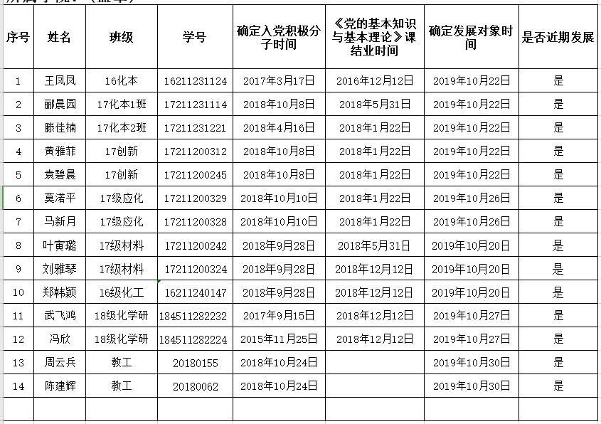 经党支部的培养教育考察,党章考试,发展对象入党答辩,并经党支部支委会审查和支部党员大会最终讨论,认为以下14名入党积极分子已基本具备党员条件,推荐为发展对象提交学院党委备案后,推荐到学校党校参加发展对象培训班学习。