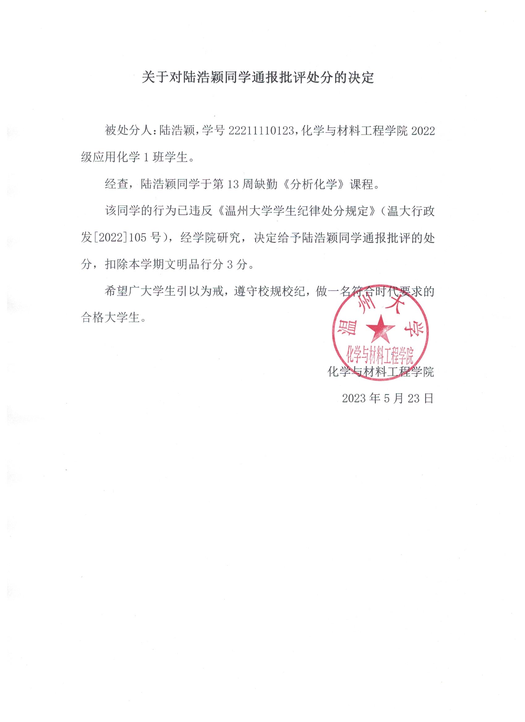 关于对陆浩颖同学通报批评处分的决定
