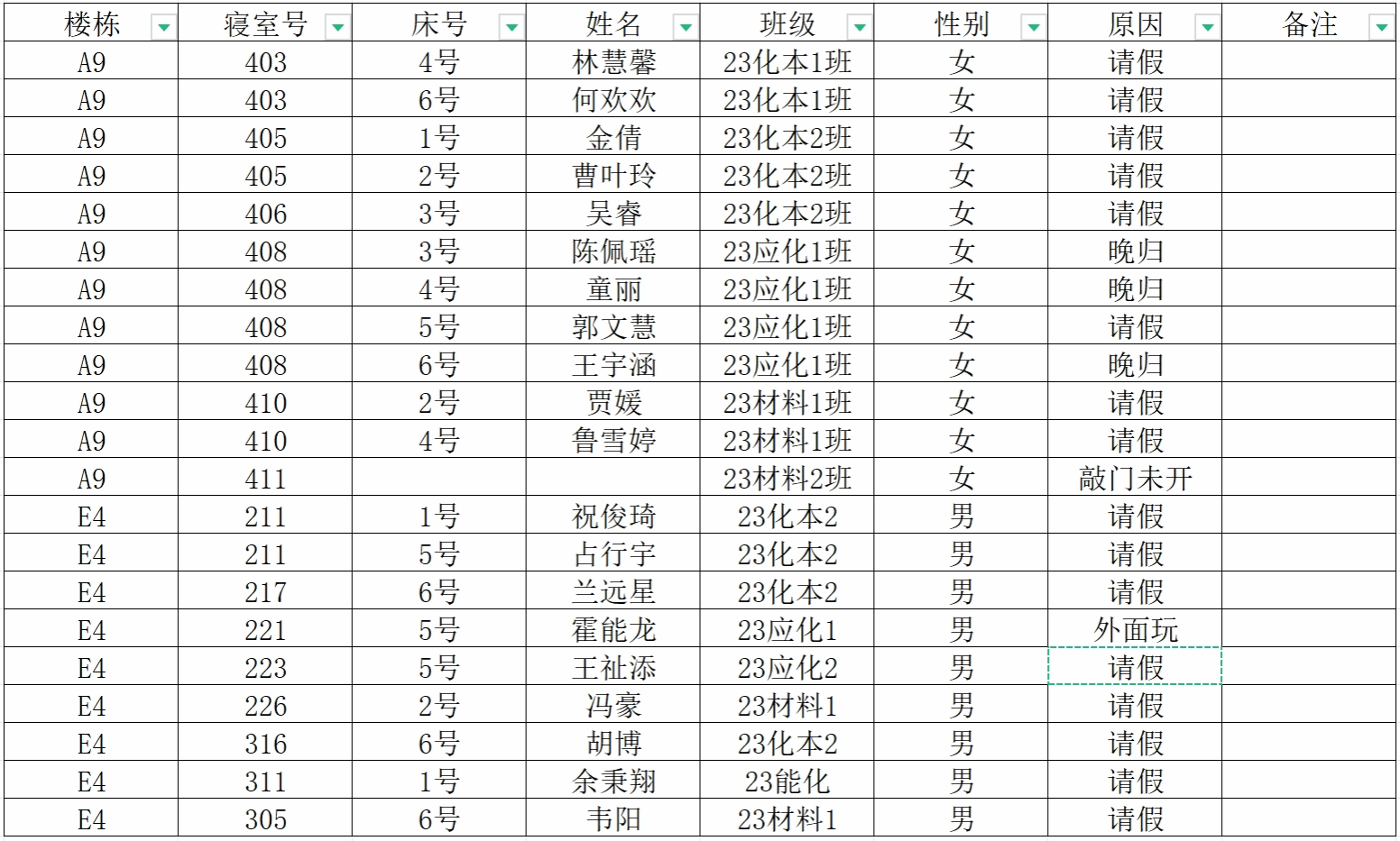 (1)请假的学生需由舍友出示请假材料;