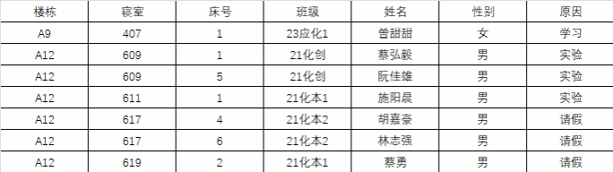 (1)请假的学生需由舍友出示请假材料;