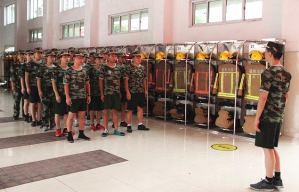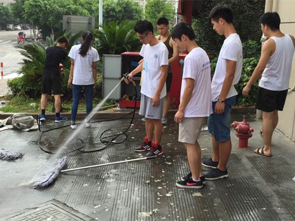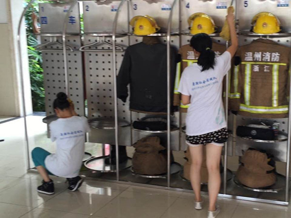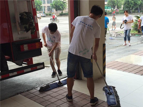 “燚焱炎火”暑期社会实践队全体队员在瓯海消防局协作消防官兵进行卫生大扫除。