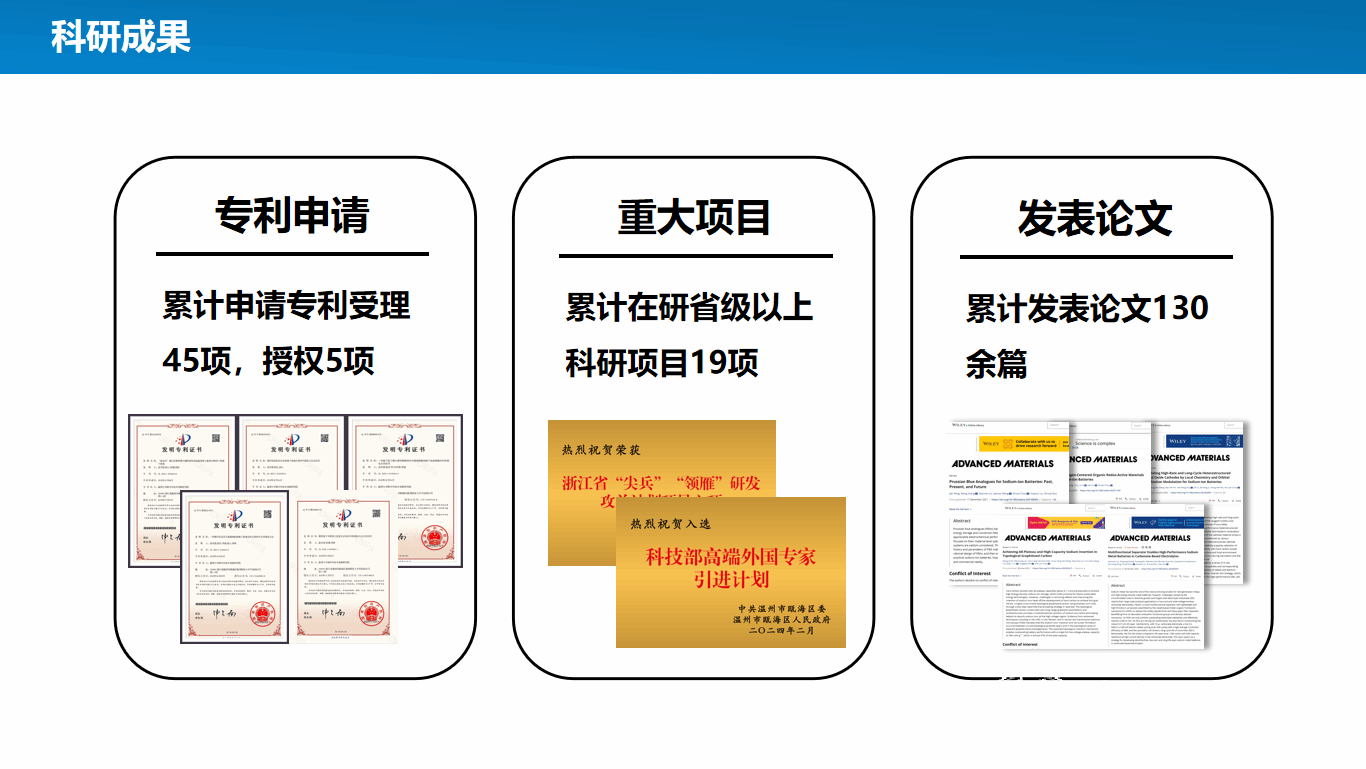 累计申请国内外专利70余项,已授权中国发明专利20余项。曾作为核心完成人参与导师窦世学院士主持的澳大利亚有史以来最大的钠离子电池项目——澳大利亚可再生能源局的钠离子电池示范项目。在钠离子电池普鲁士蓝正极、生物质硬碳负极以及阻燃电解液的创新性研发,已成为世界三大主流技术路线之一。