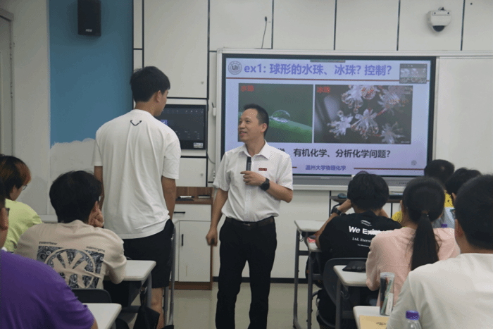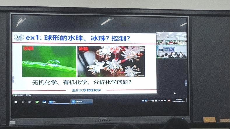 课堂上,王舜教授围绕“物理化学绪论”主题,以深入浅出的方式,首先提出了“为何学”物理化学的思考,通过一系列引人入胜的实例——球形水珠与冰珠的奇妙变化、面粉爆炸的科学解释,以及硅胶作为高效干燥剂的原理等,迅速点燃了学生们对物理化学的好奇心与探索欲。他以生动有趣的讲解,让复杂的物理化学概念变得直观易懂,极大地提升了学生的学习兴趣。进而以学生个性化专业发展诉求为导向,结合“学什么”、“怎么学”,顺势带领学生展开学习方法和研究对象的碰撞交流,最后从物理化学的特点引出对“悟”化人生、生涯规划的深度思考。王教授善在课堂中以细节打动人心,在潜移默化中将思政之“盐”溶于课程之“汤”,在专业教育中不断增强学生的价值认同和道路自信,激发了学生立志科技报国的“课程思政”之效,得到了两校师生的热烈回应。